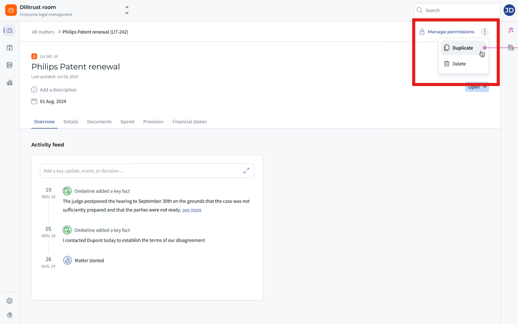 With Matter Duplication, you can now create a new matter based on an existing one — saving time while ensuring consistency.