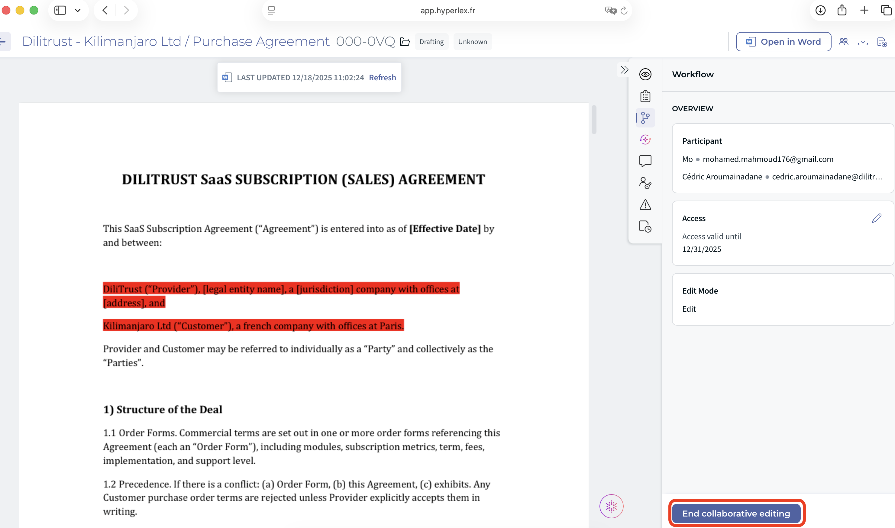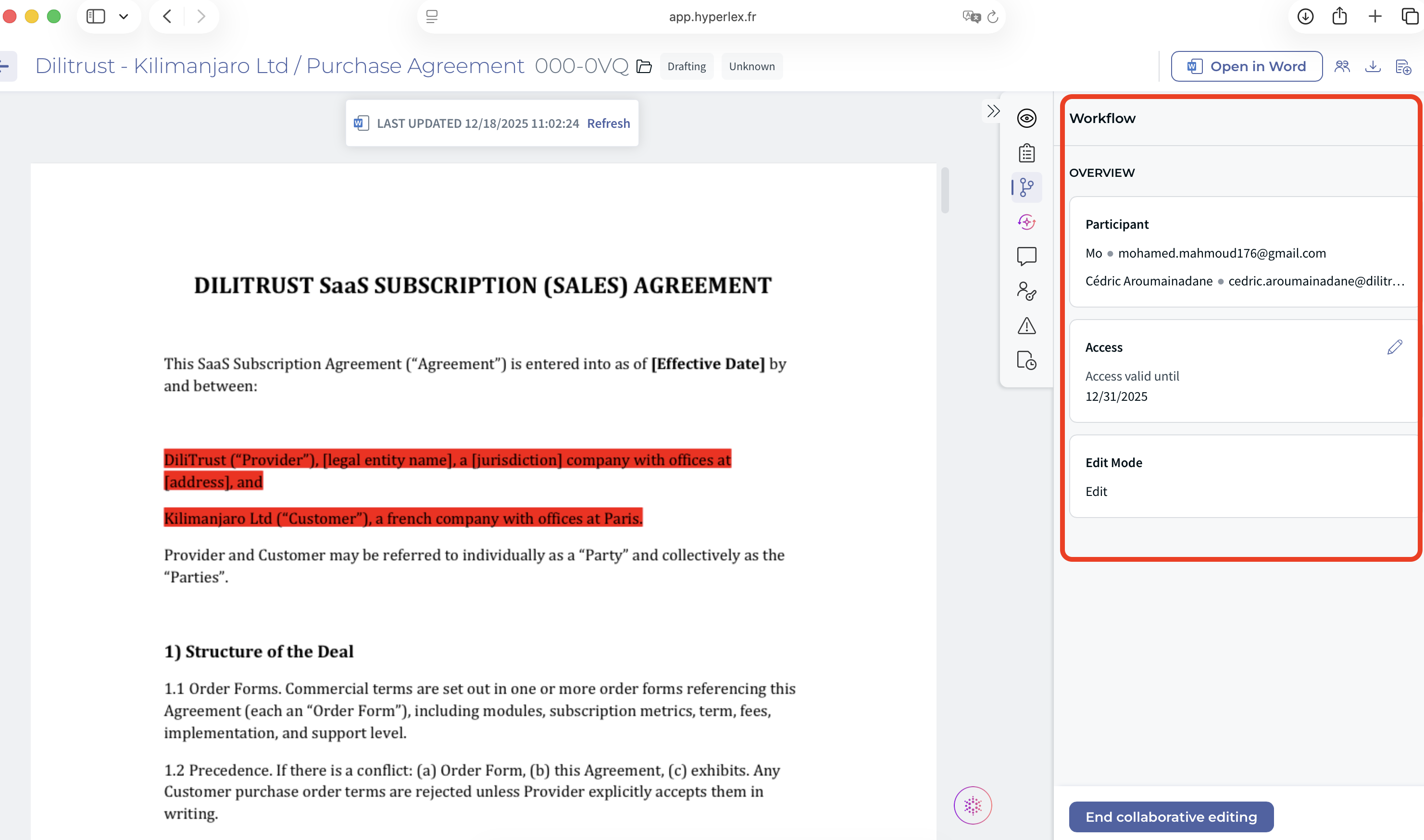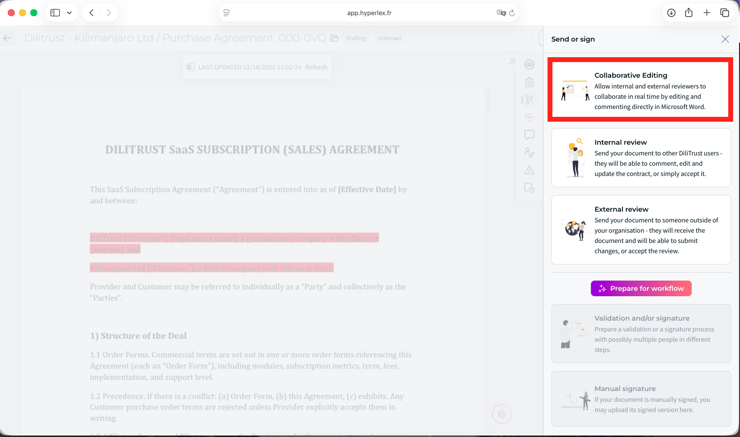 Use Collaborative Editing whenever you need several people to review or update a document at the same time — for example, during contract negotiations, NDA reviews, or multi-stakeholder approval processes.