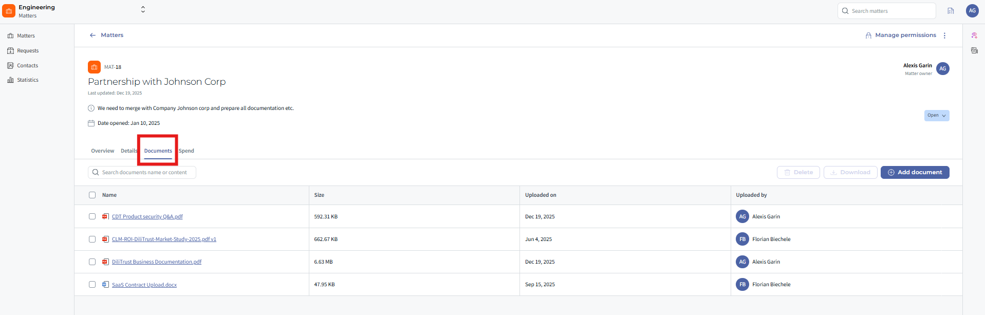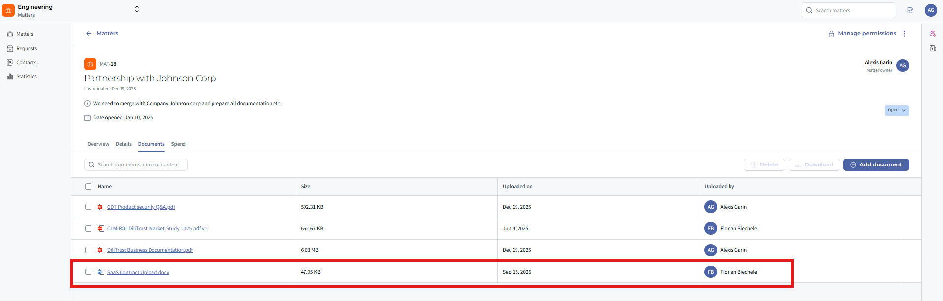 - Document access follows the matter’s security rules.