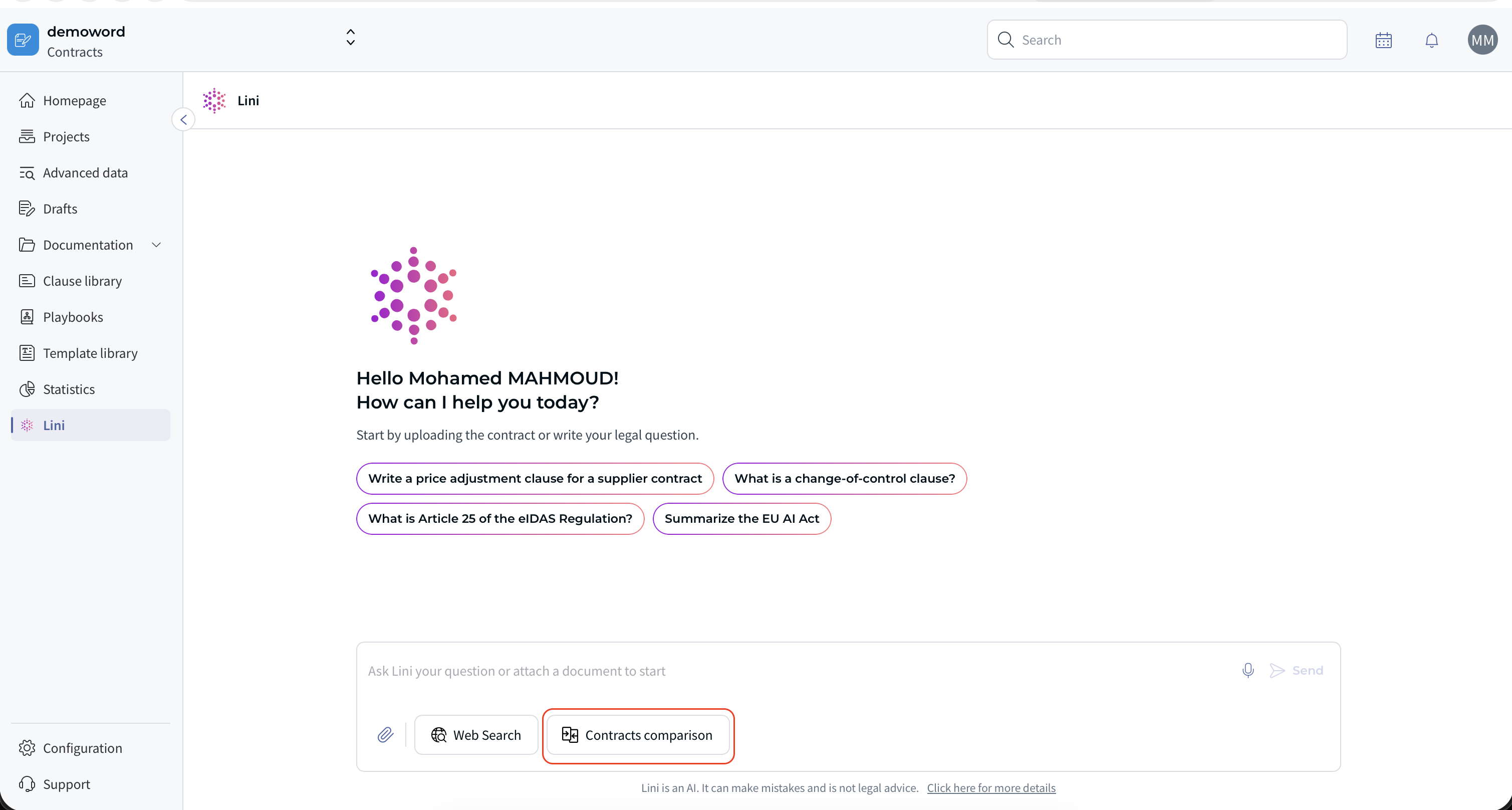 The AI Chat is now available as a standalone, full-width feature directly from the side panel. You can ask general legal questions, attach and compare multiple contracts, and even search the web — all without leaving CLM.